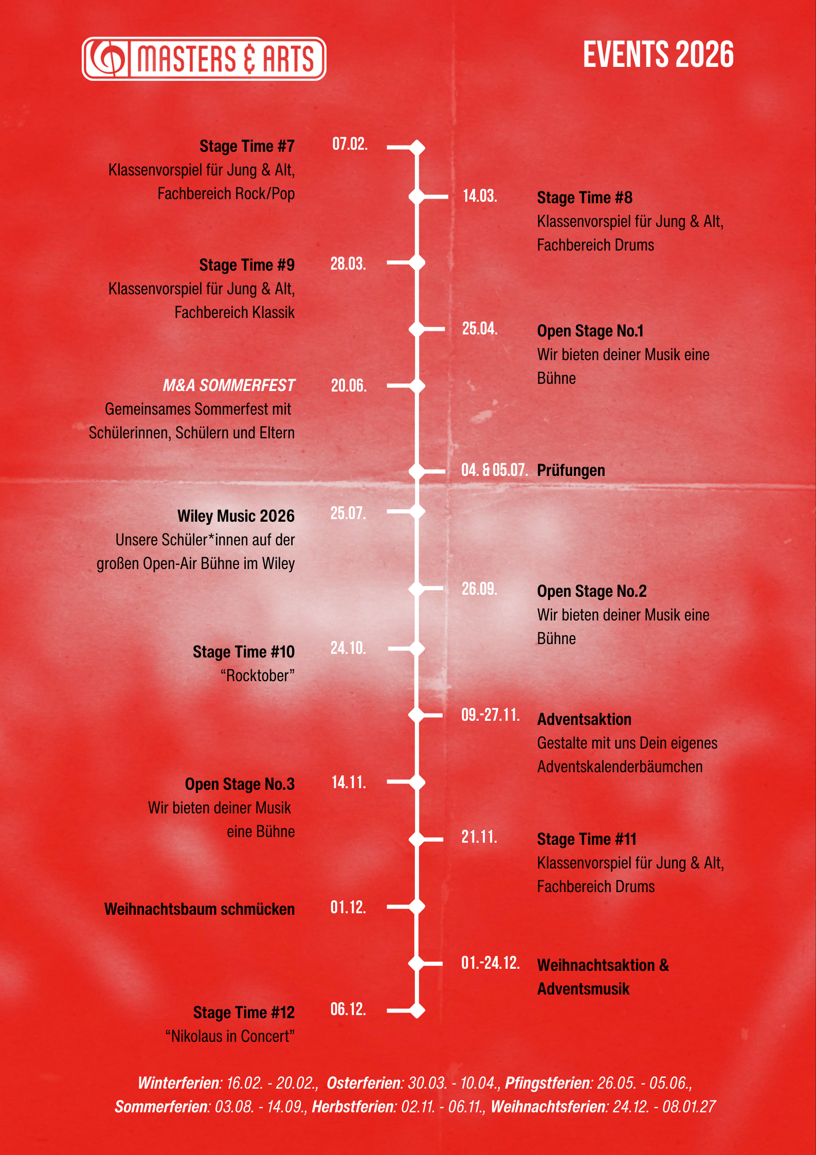 Unser Jahresplan für 2026 ist jetzt online. Auch 2026 geht’s bei Masters&Arts wieder rund: Unsere Open Stage feiert Premiere, bewährte Formate wie die Stage Time gehen in die nächste Runde. Wir freuen uns auf ein Jahr voller Proben, Applaus, Lampenfieber und Gänsehaut. Den kompletten Jahresplan findet ihr jetzt hier auf Instagram oder bei uns in der Schule – speichert ihn euch ab und seid dabei!